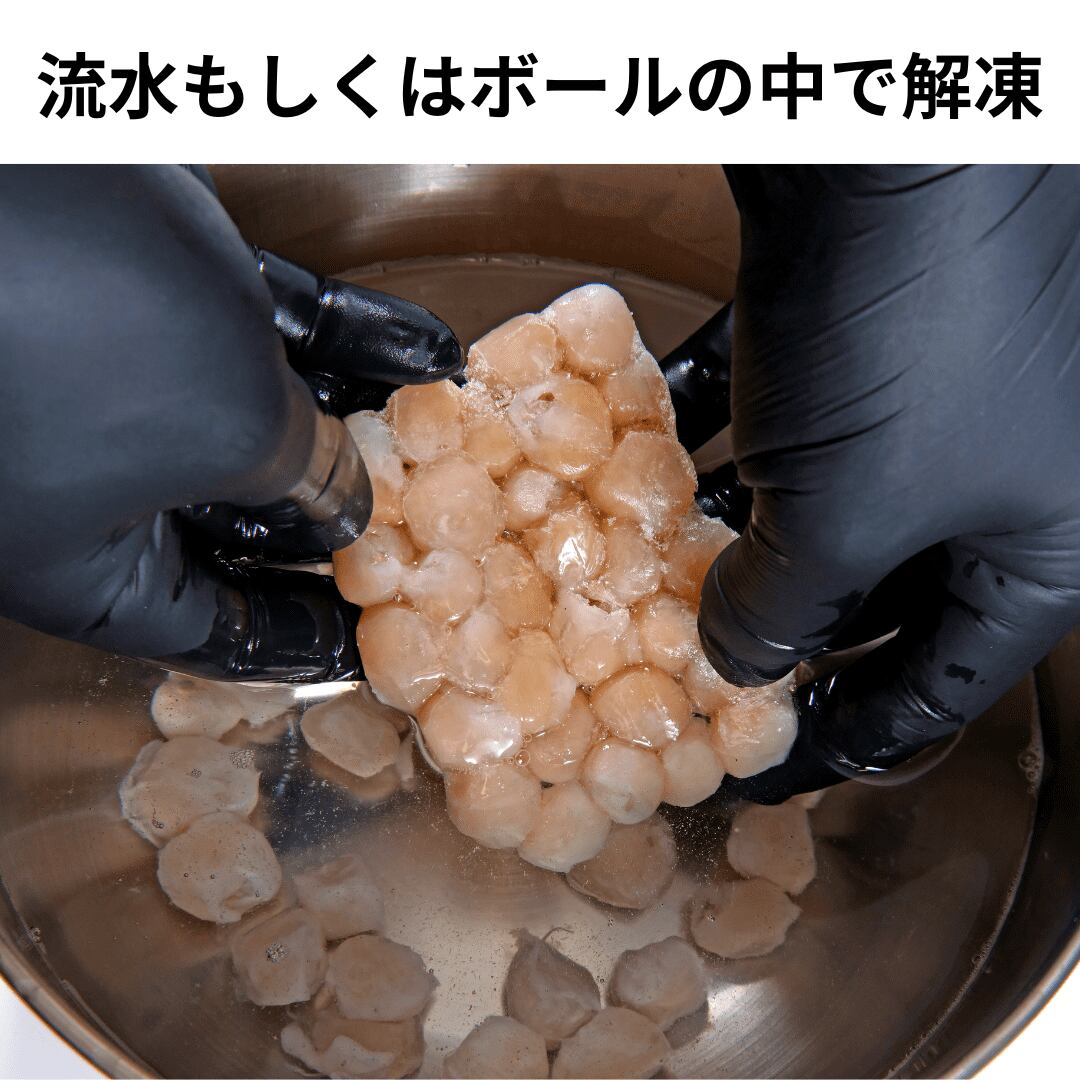 流水もしくはボールに水を入れ少し時間をおくだけで簡単に解凍できます。蔵庫に入れておいても解凍可能です。その際は水分がでるので、お皿などの上にめぼうを置いて解凍をしてください。
